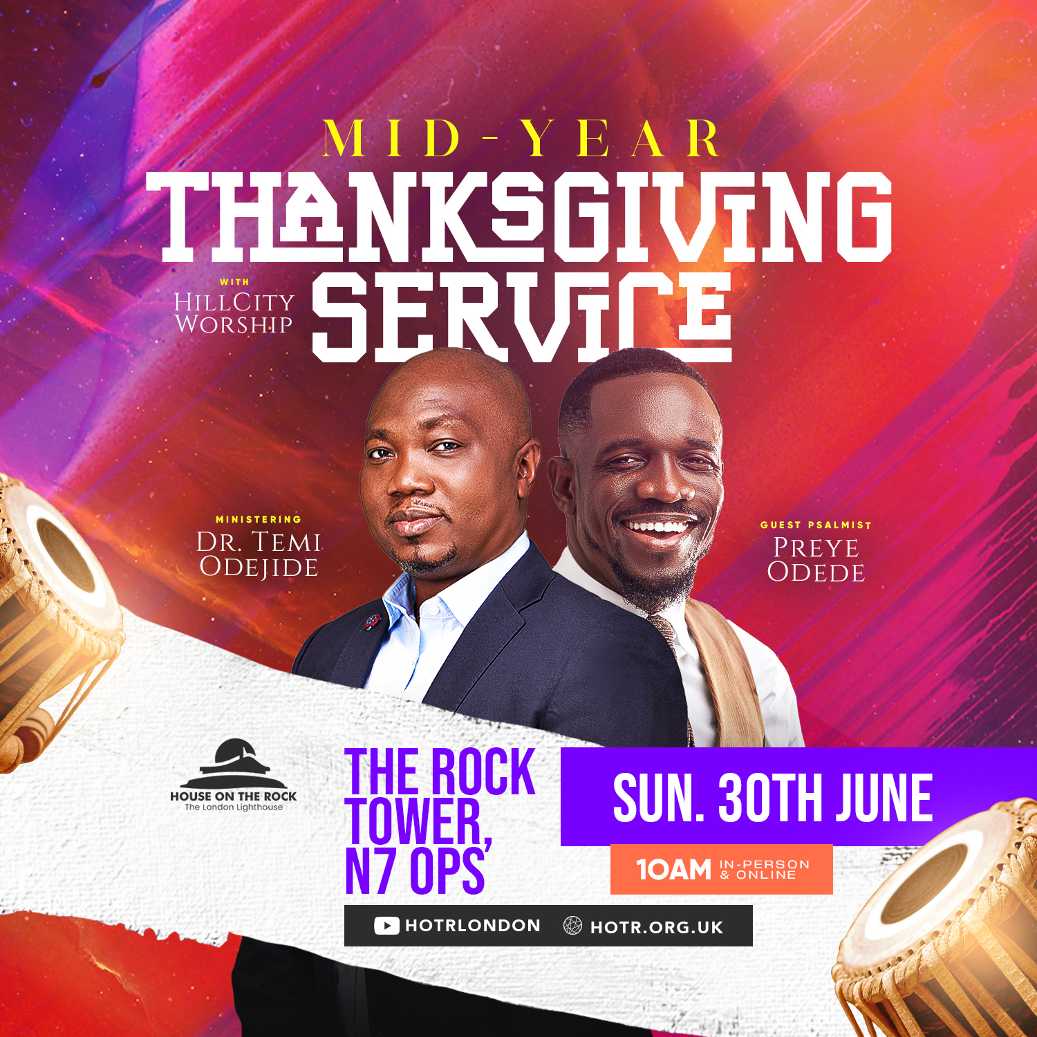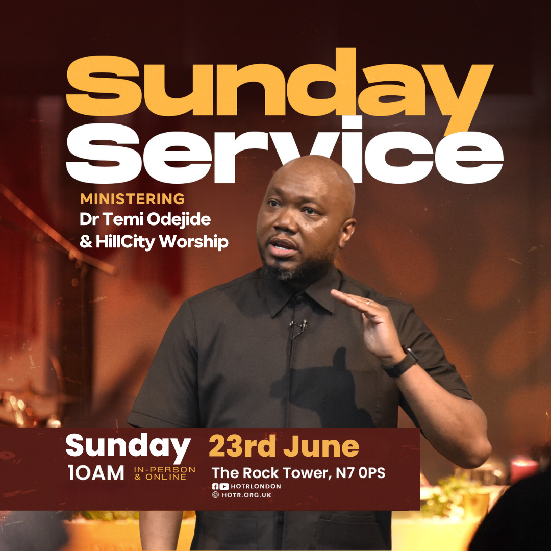 Join us for our Mid-Year Thanksgiving Service from 10am with hosted by our Resident Pastor, Temi Odejide and Guest Psalmist Preye Odede and HillCity ministering with music! Worship with us either in-person or online via Youtube (@hotrlondon) or our website (hotr.org.uk).