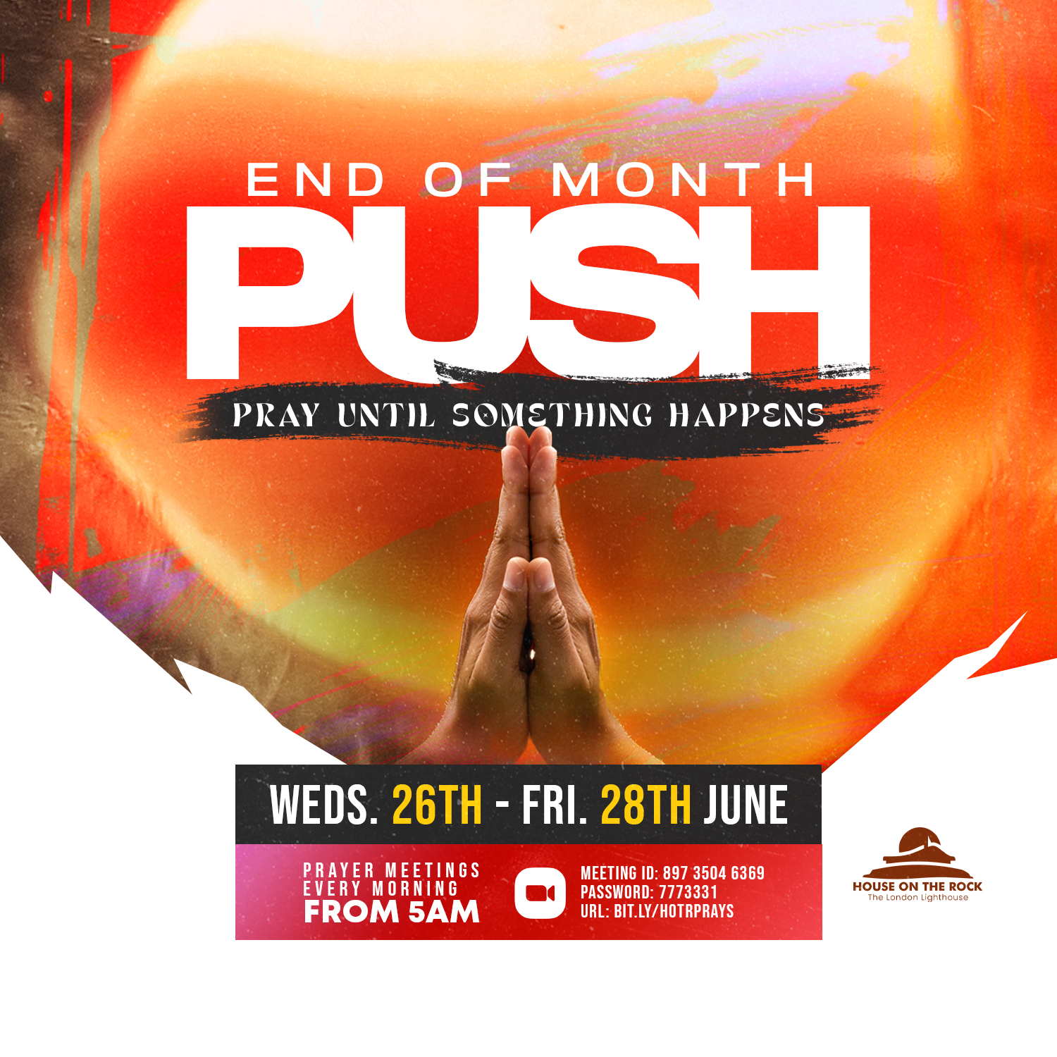 Join us in the place of prayer and fasting in our 3-Day End of Month PUSH (Pray Until Something Happens). Dial in to our Prayer Meeting from 5-6am on Weds to Fri via Zoom Meeting ID: 897 3504 6369; Password: 7773331; URL: bit.ly/hotrprayer